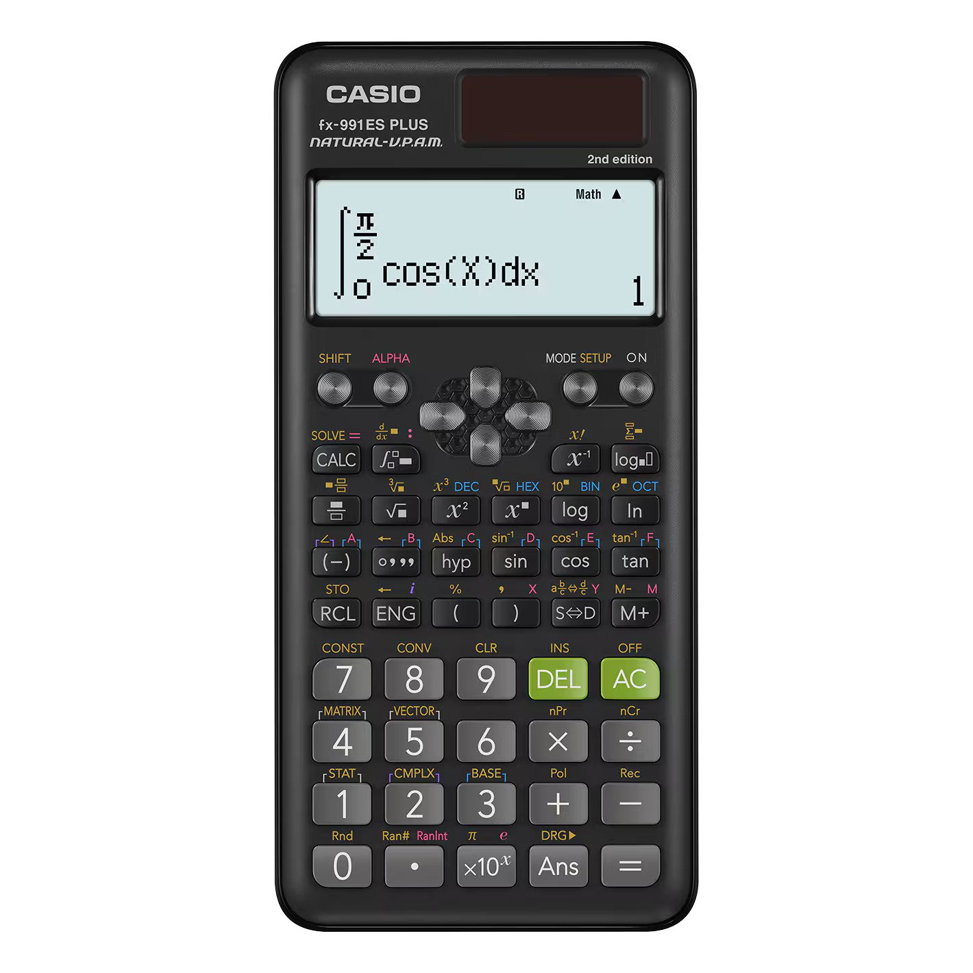 The Casio fx-991ES Plus 2nd Edition (Local) is a non-programmable scientific calculator with 417 functions, featuring a Natural Textbook Display (V.P.A.M.) that shows fractions, derivatives, integrals, and roots as they appear in textbooks. Ideal for engineering and science students, it handles advanced math including matrix, vector, statistics, equation solving, complex numbers, and base-n conversions.